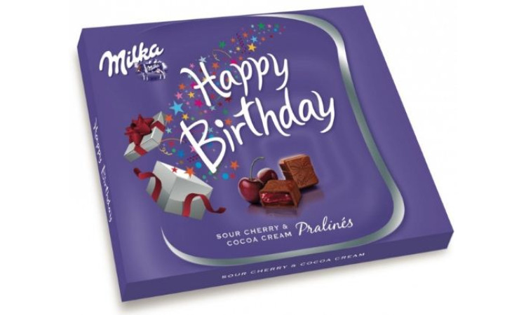 Milka Happy Birthday Alpine Milk Chocolate Praline Cherry Cocoa Cream and Cherry Filler .
